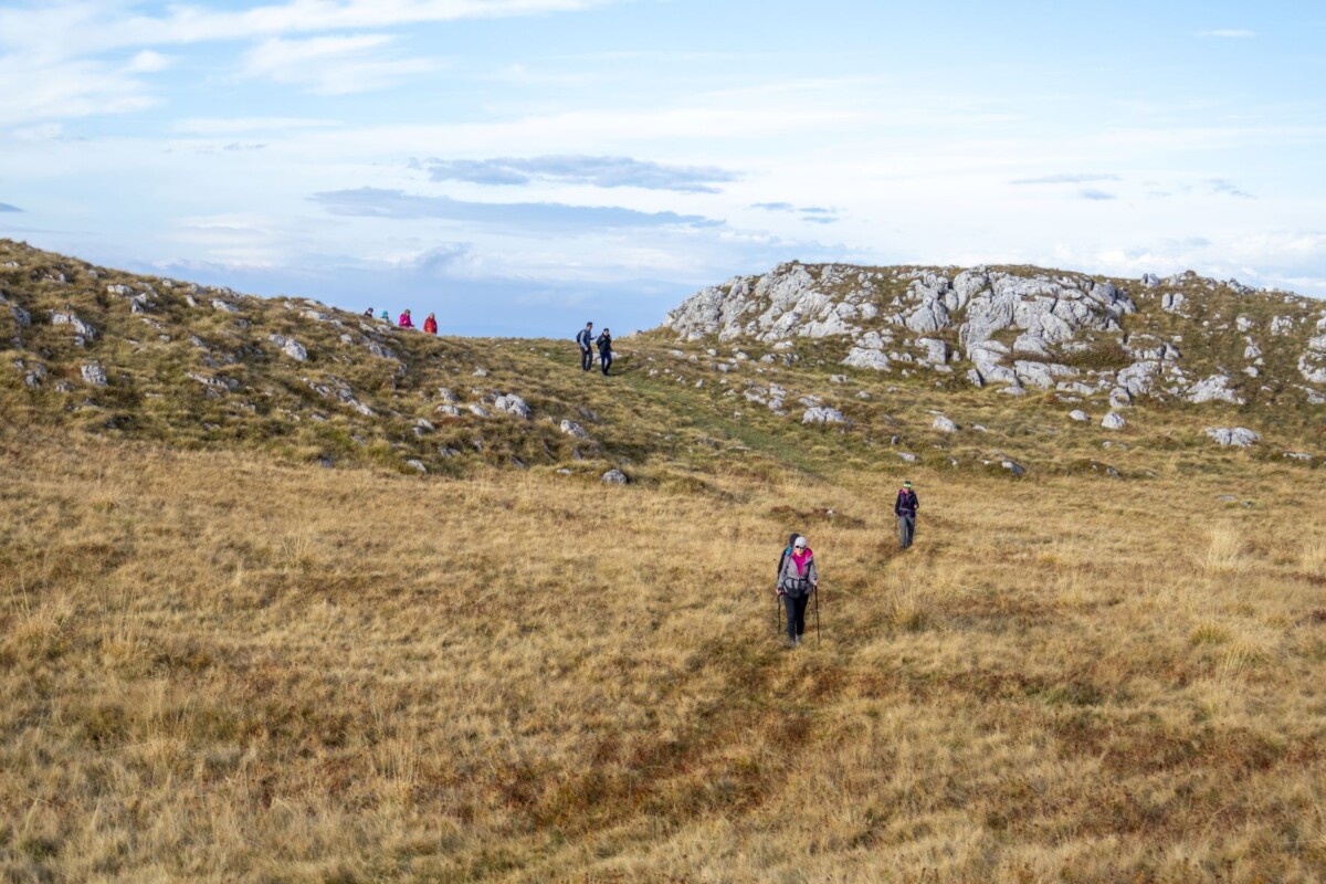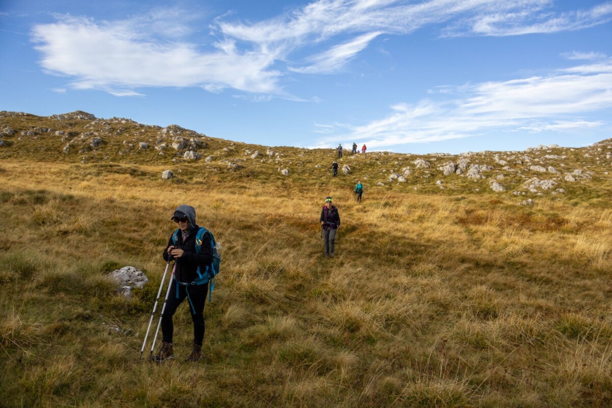 Ukupno je 23 planinara krenulo prema vrhu Paljenik. Nakon zahtjevnog i strmog uspona dvoje kolega odustalo je i vratilo se u dom, ali ostali su nastavili. Napredovali smo preko travnatih pašnjaka, a uspon smo nastavili nakon što su se crni oblaci povukli i sunce probilo — pravo planinarsko vrijeme!